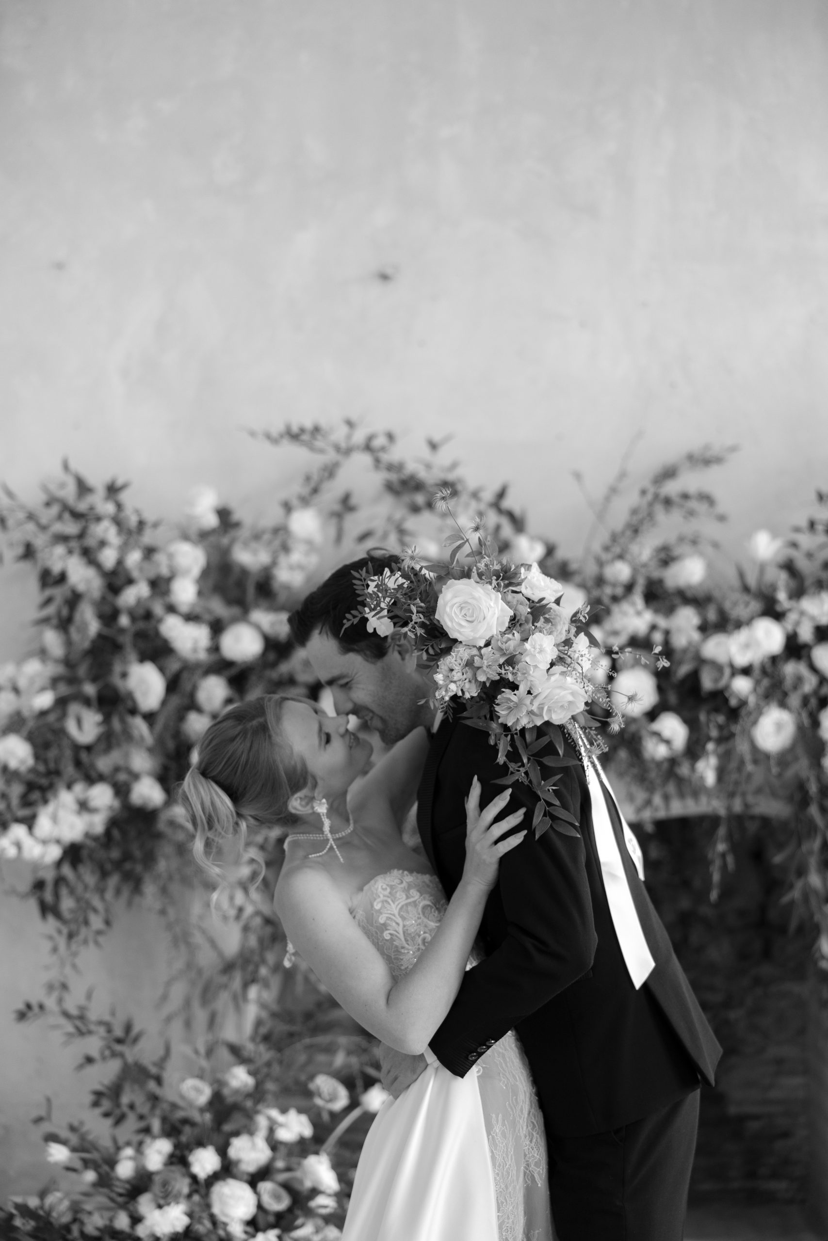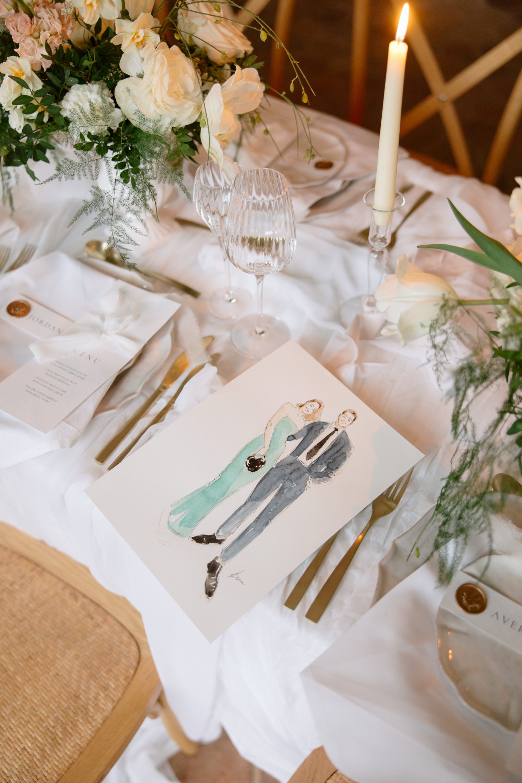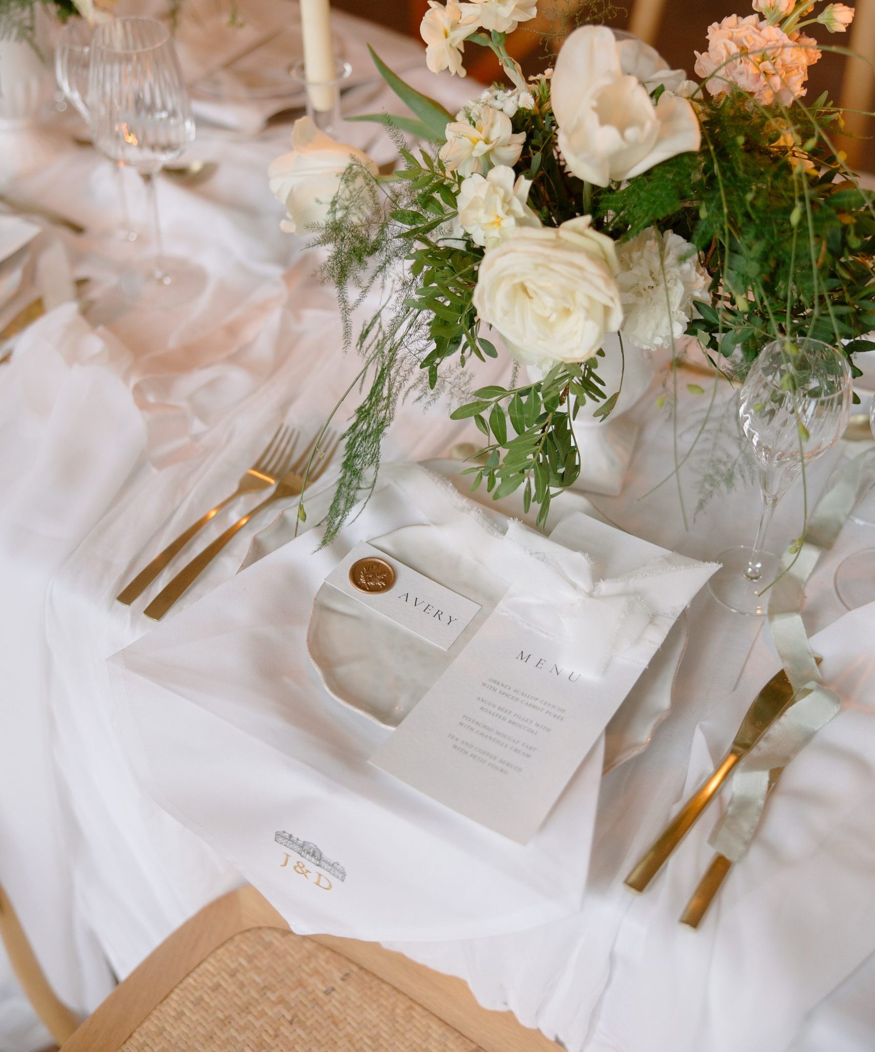 The décor focused on clean lines and soft neutrals. Reception tables were draped with white organza to create movement and romance. For the table flowers, loose floral arrangements in ivory, white, and soft peach echoed the flowing tablecloths. We used gold flatware, and clear glassware to compliment the place settings with our custom wedding menus tying the design together. Each place setting featured a personalised name card with a gold wax seal, adding a detail that felt polished but not fussy. The menus, printed on high-quality textured paper, kept a minimal layout that matched the overall aesthetic. And to finish, we handtied each card with a silk bow.