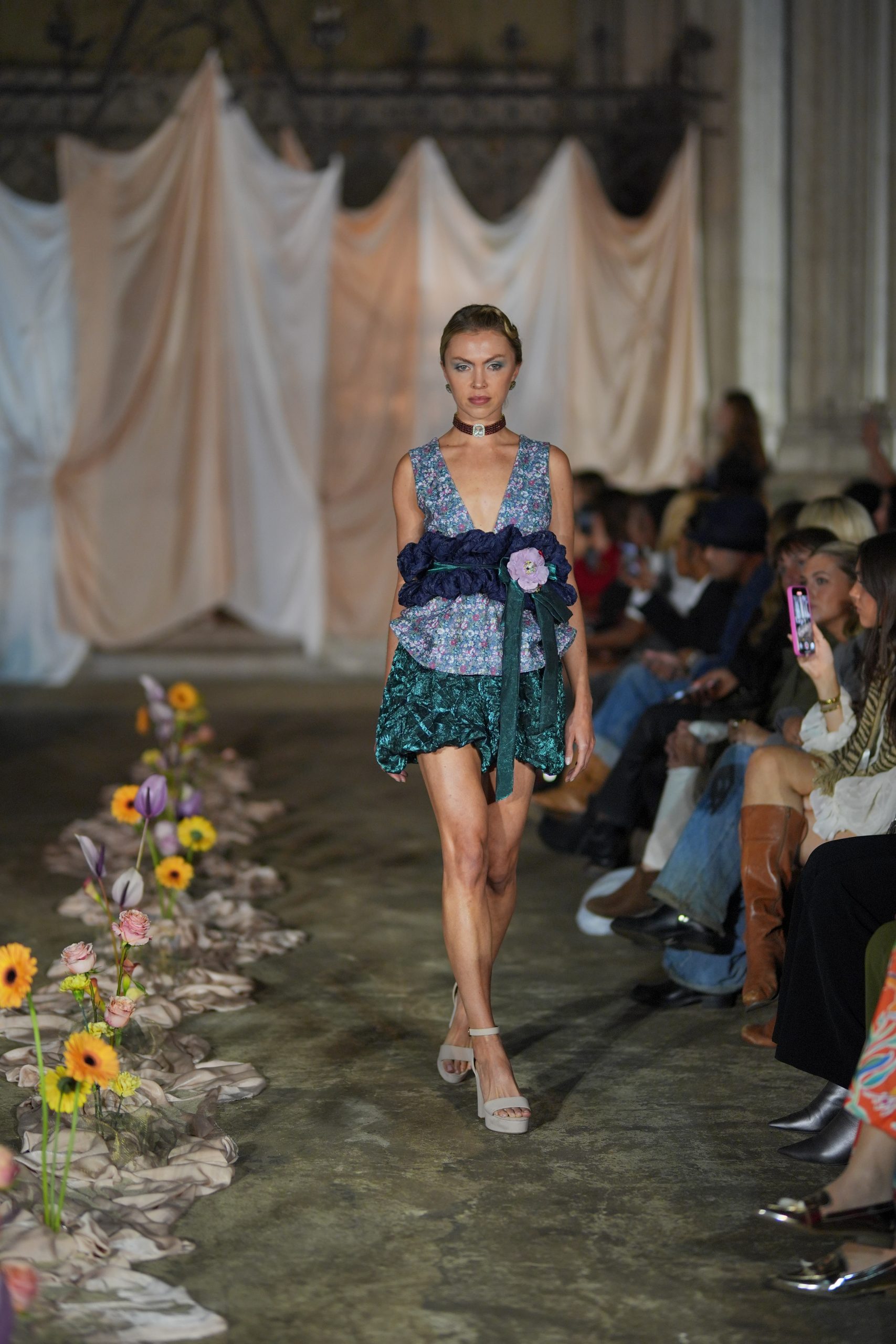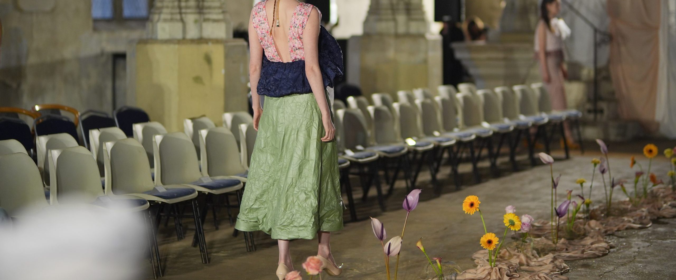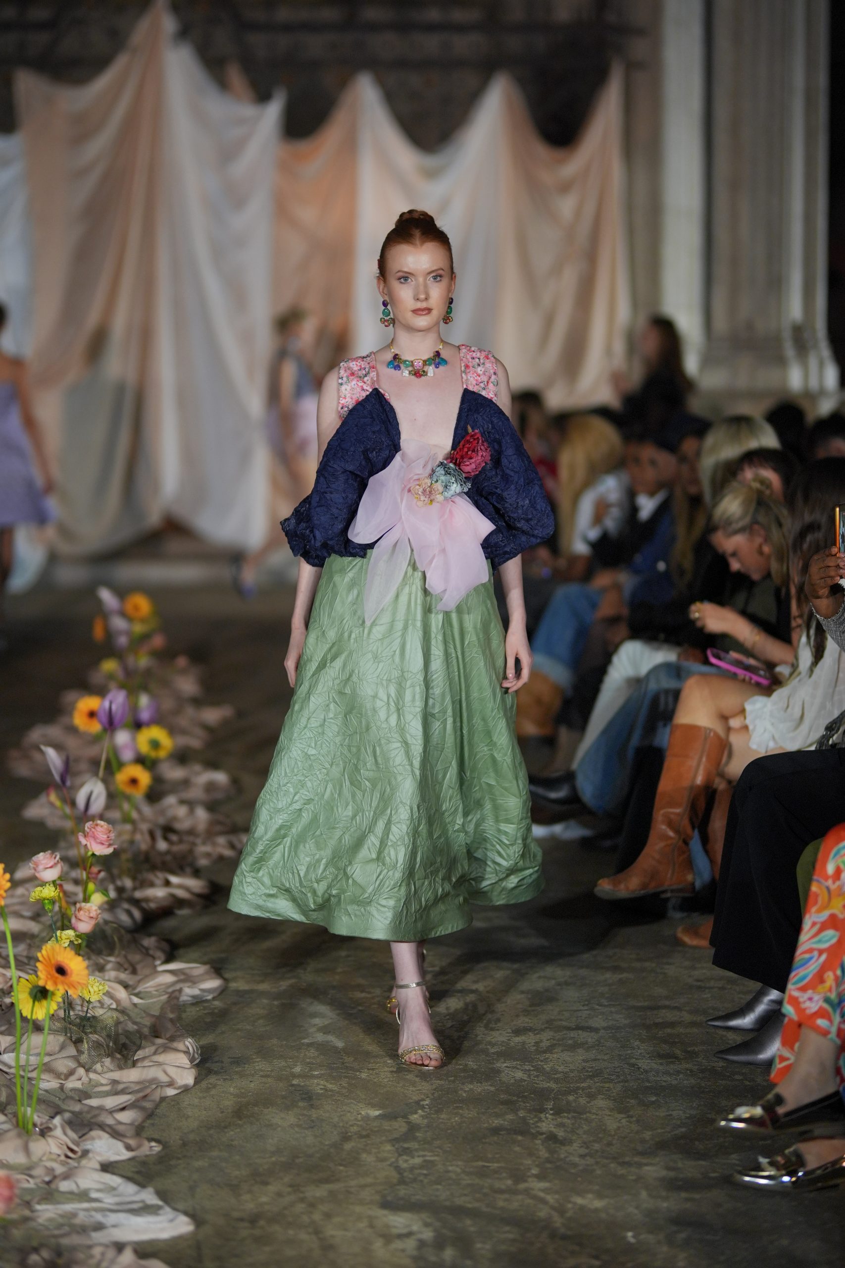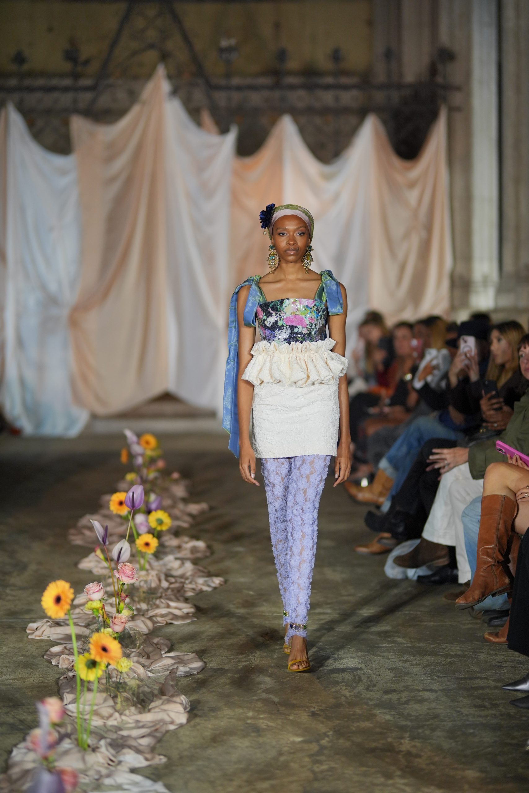 A dramatic draped centrepiece anchored the runway, with fresh florals adding a sense of wild, natural beauty. At the back of the runway, custom draping softened the architecture while discreetly concealing the models as they stepped through the curtain. The neutral tones made sure all eyes were on the outfits as the models made their entrance.