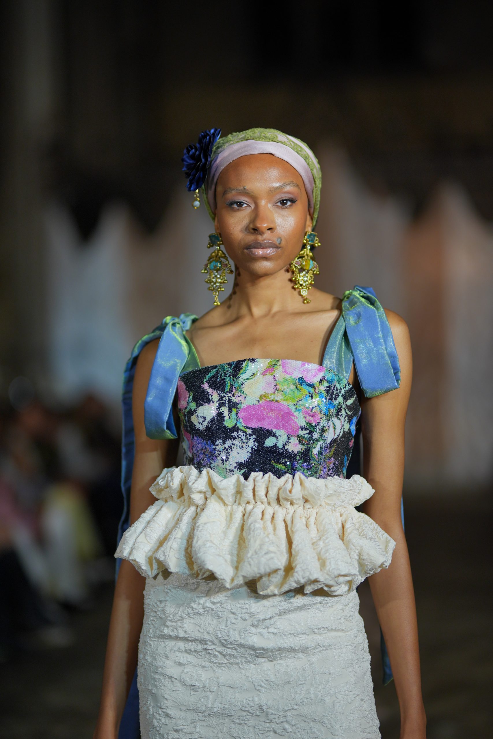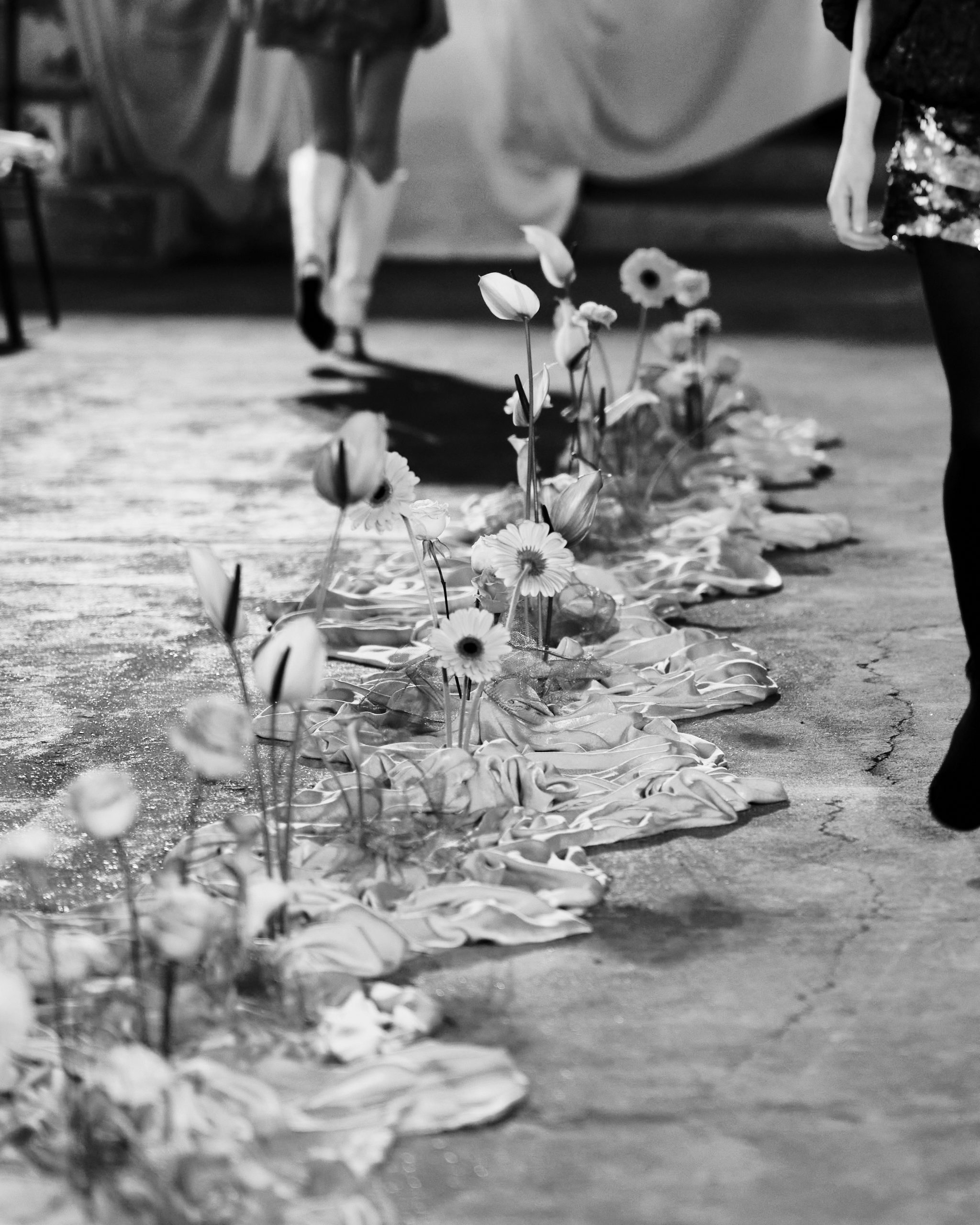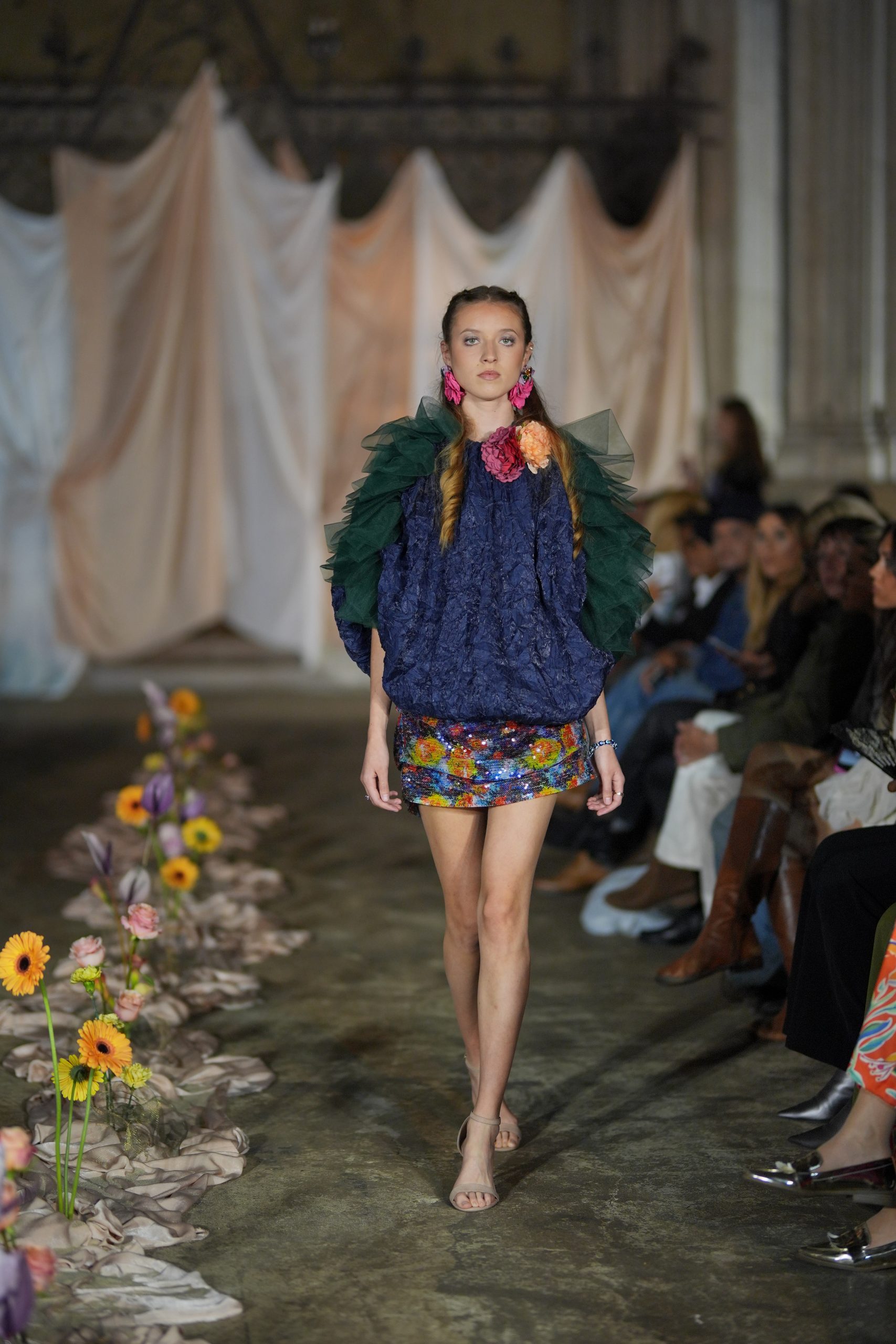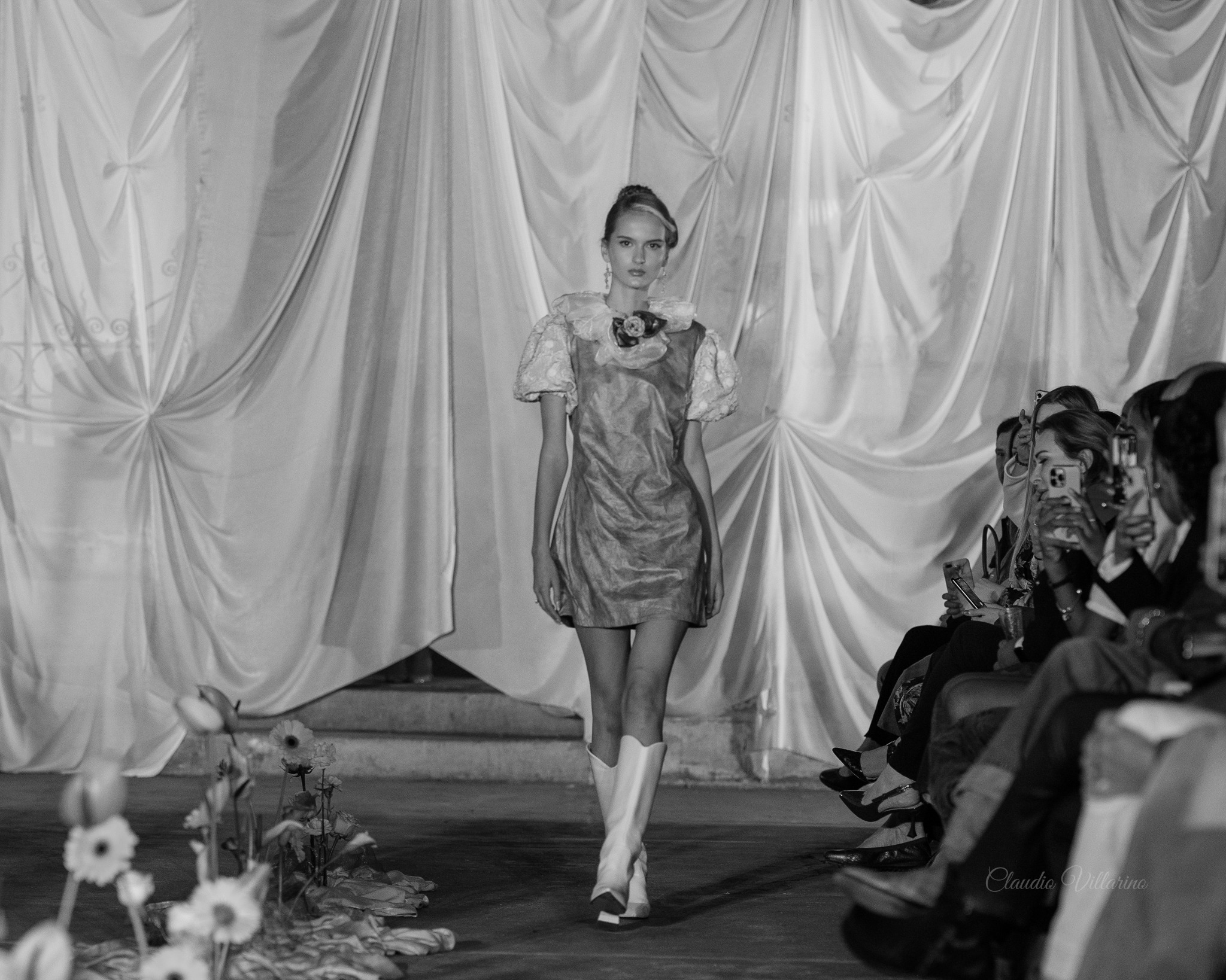 A dramatic draped centrepiece anchored the runway, with fresh florals adding a sense of wild, natural beauty. At the back of the runway, custom draping softened the architecture while discreetly concealing the models as they stepped through the curtain. The neutral tones made sure all eyes were on the outfits as the models made their entrance.